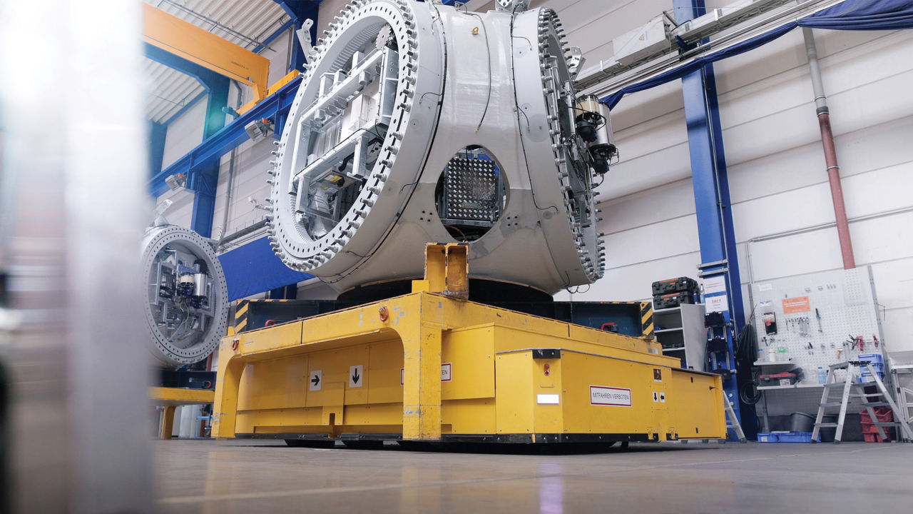 Moving 450 tons off-shore wind turbine with a mobile robot platform along the production line.