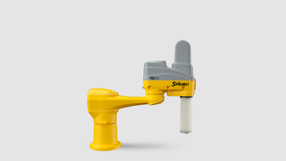 设备集成商提出一种基于史陶比尔TS60 Scara四轴机器人的解决方案。TS60机器人具有很高的速度,并具有更宽的覆盖范围和灵活性,机器人臂可以靠墙安装在工作区域的一侧,空间利用率高。