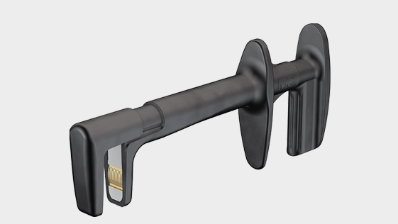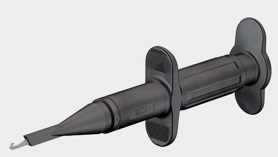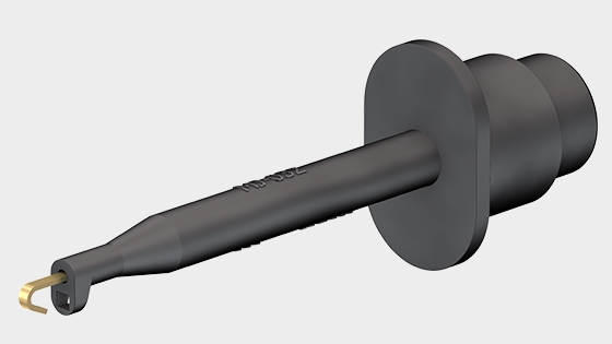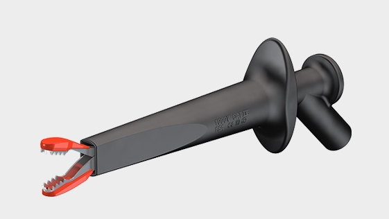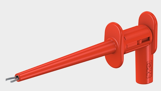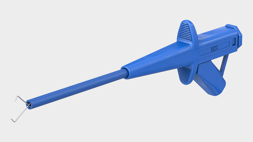 With rigid hook clip made of steel for hooking onto wires. Ø 4 mm rigid socket in handle accepting spring-loaded Ø 4 mm plugs with rigid insulating sleeve.